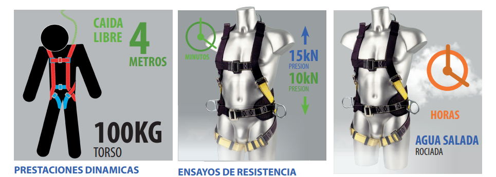 Para garantizar la efectividad de los arneses, la norma EN 361 establece tres pruebas principales de seguridad: